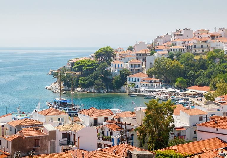 By Plane from: Athens Eleftherios Venizelos airport and By Boat from: The port of Agios Konstantinos, Volos or Thessaloniki